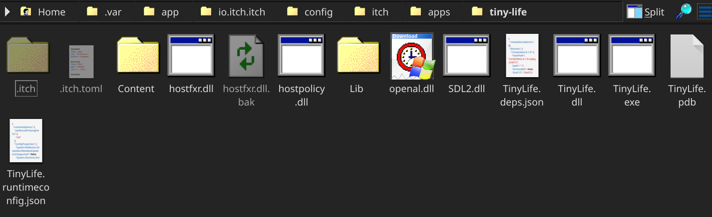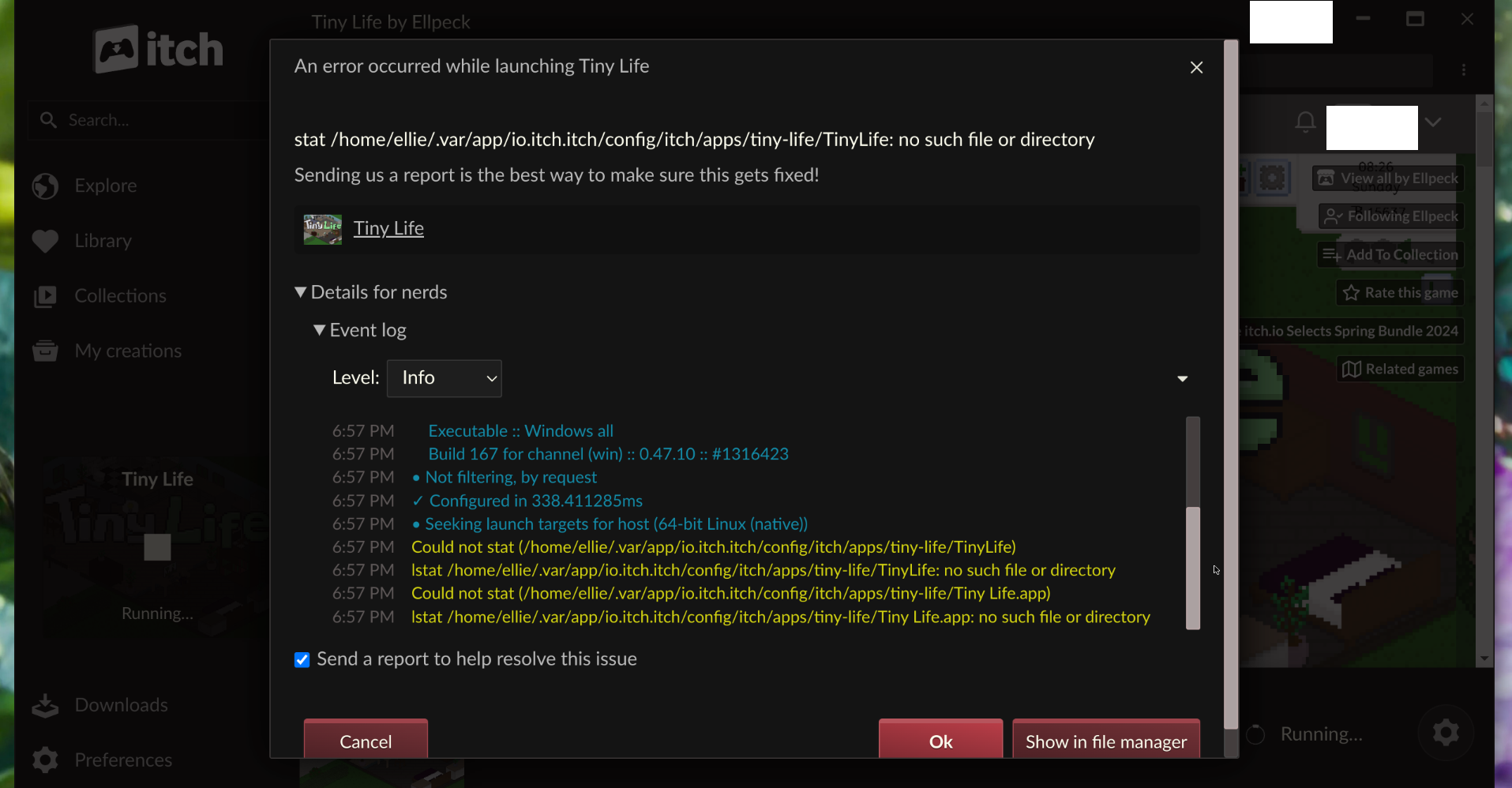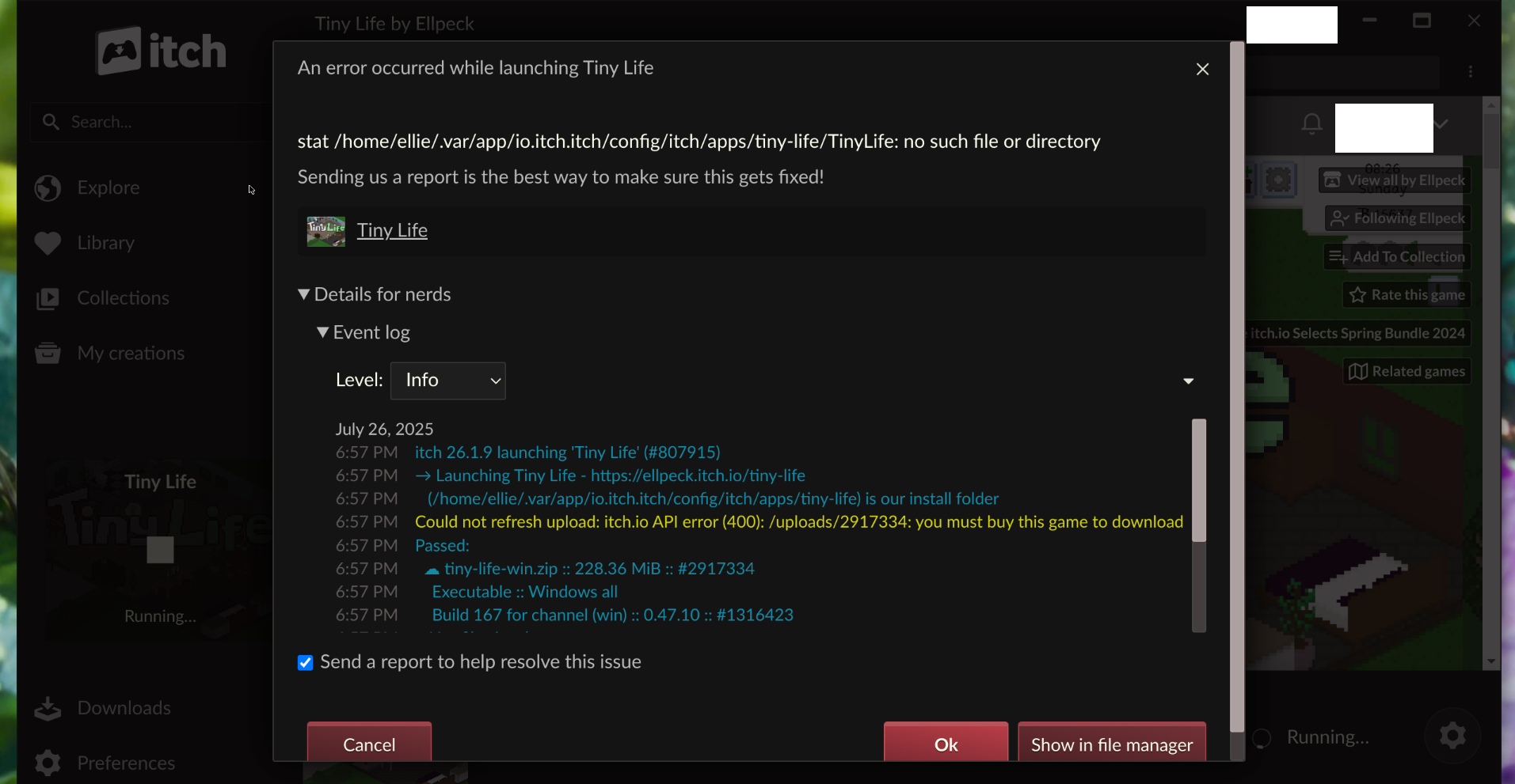 When I try to launch Tiny Life in the flathub io.itch.itch client, I get this strange error. I installed the Windows version assuming it would use wine, since often the Windows version is updated more, and I have sandboxing disabled in the itch client: