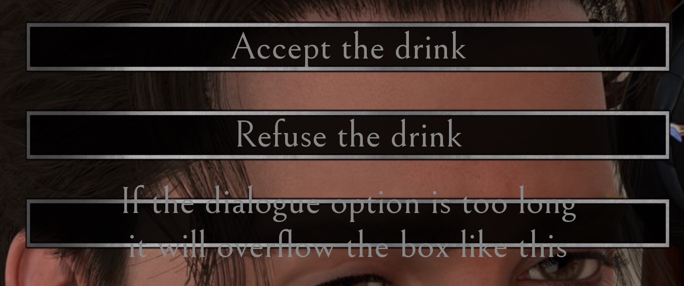 Hey Cal! I wanted to put in a request for an update to the pack (or maybe this is already a feature and I'm missing it). There are a few choices in my game where it would be nice to have a little bit of extra space in the choice box. Currently, I have to keep it pretty short otherwise the text clips out of the box. Would you possibly be willing to update it so that if the choice goes beyond the normal bounds it uses a second box asset that has two rows in it?