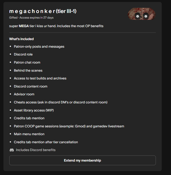 My friend gifted me a $15 patreon subscription from the author MrDrNose, connected the patreon to Itch, but I get the error: "We had some trouble connecting your account. You don't have a pledge for EternityDev creating Animations and videogame", although I have a subscription and I have the correct patreon account connected
