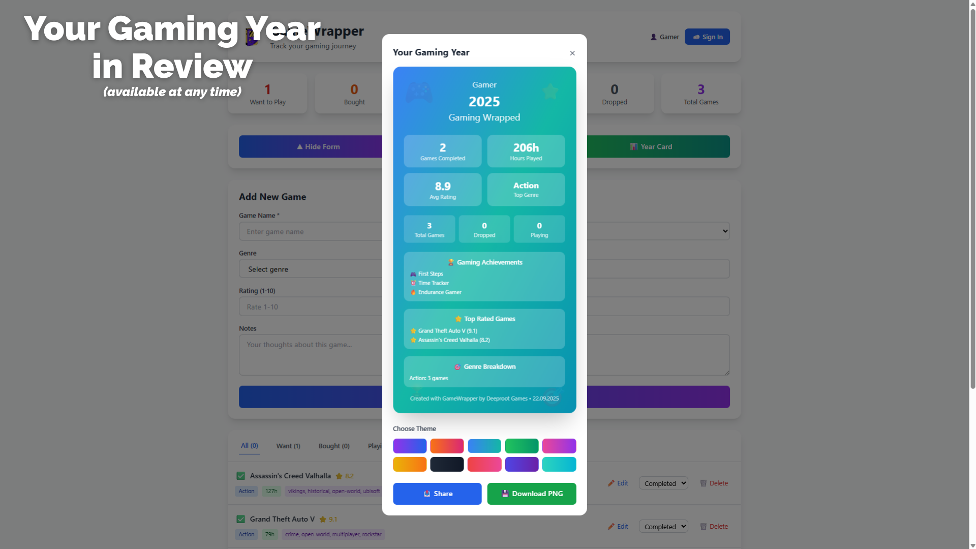 Track your games, celebrate achievements, and get a clear picture of your gaming habits and progress.