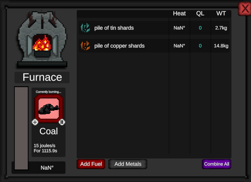 2) The mechanics of melting are not clear. At first, I tried to transfer copper through the inventory, but it cooled down. Then I found the furnace button in the crucible, and it turned out that copper at 50 degrees can be poured :)