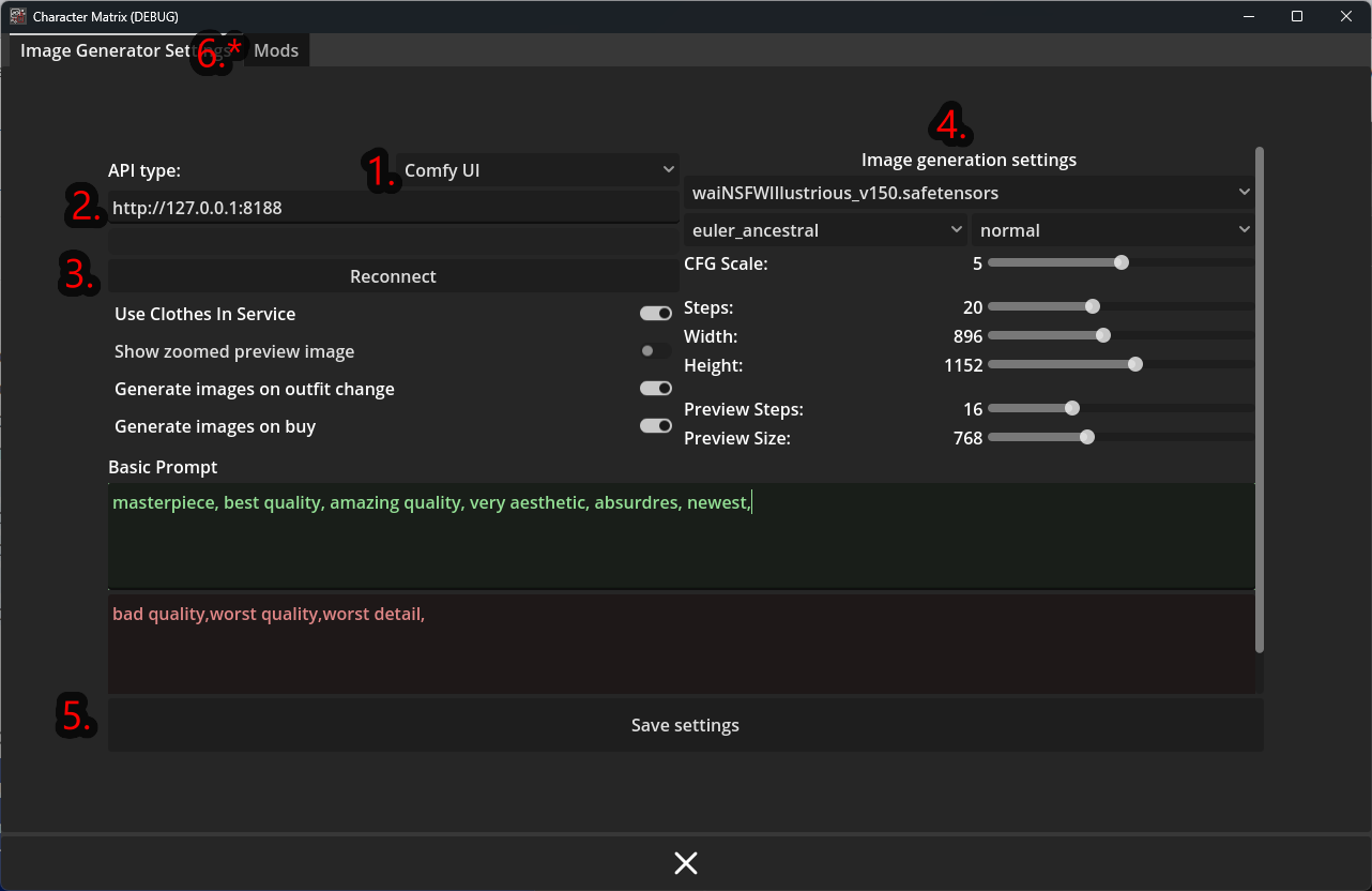 After I sent the message. I decided to try some testing. After opening ComfyUI in browser, I did an image generation. I went back to the game and set my settings for the model to use. Went to the market page and it generated a pic but not in the bigger section until I did a regenerate. I went back to settings to check something and the connect button still said Reconnect. I don't know if it's suppose to that, but now it does generate. I'm just having trouble how to actually play it lol. Also, ComfyUI uses dropdown menus listing LoRAs. And where did you get the v150 of the waiNSFW model? I still have the 110. I've been checking Civit a lot. One more thing. If there's suppose to be folders with the game. There isn't. It's just the game and the pck file.