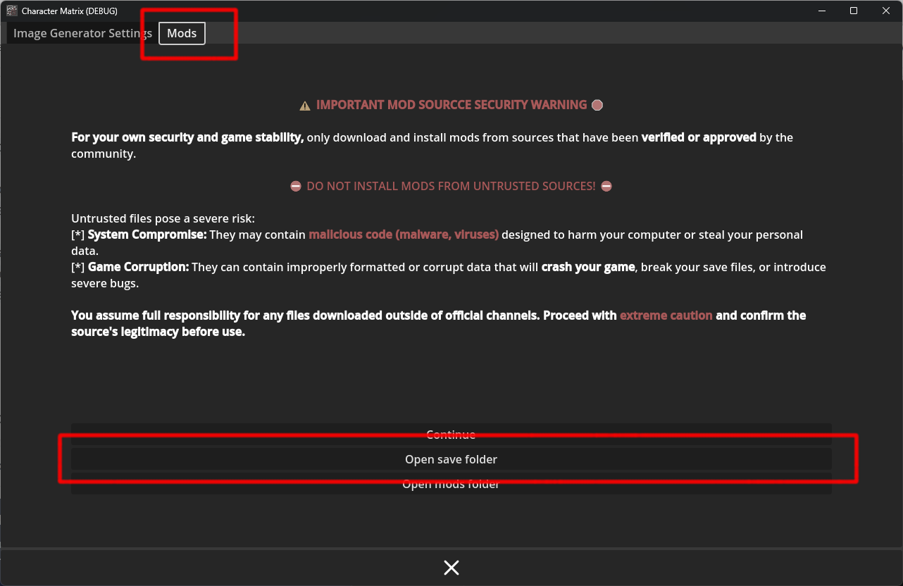 If you encountered problems in steps 3-4, there is something wrong with the connection. If this is the case, I would appreciate a screenshot and log file. You can find it in the game folder. You will find a button to open the save folder in the mods tab (6*).