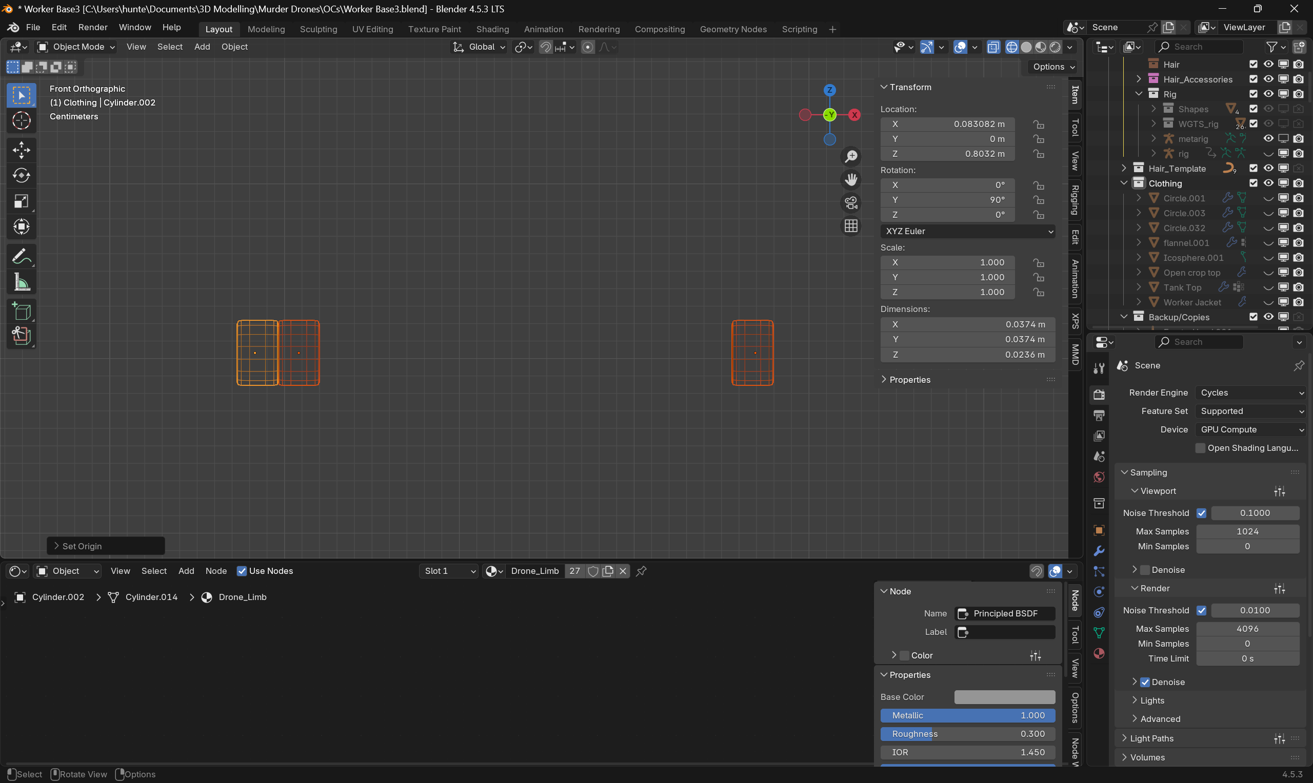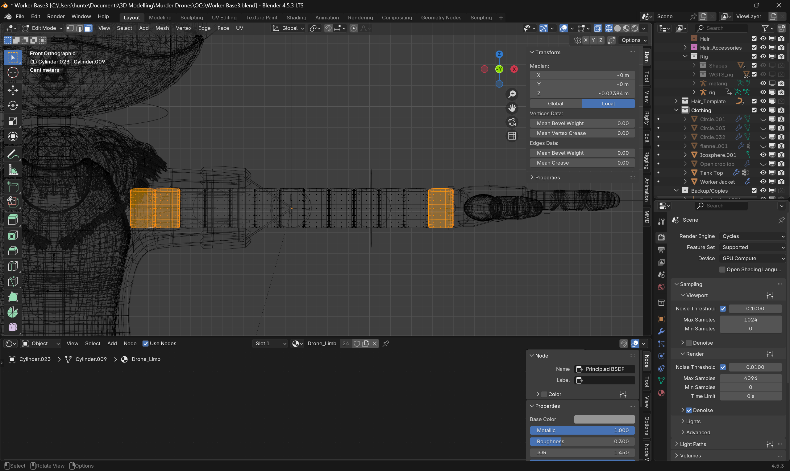 First, I took the old worker drone model (I have an edited version for OCs but it's the same for others) and isolated the cap on either end as well as one of the segments, further separating them into three objects (I later deleted the two caps and only used the regular segment)