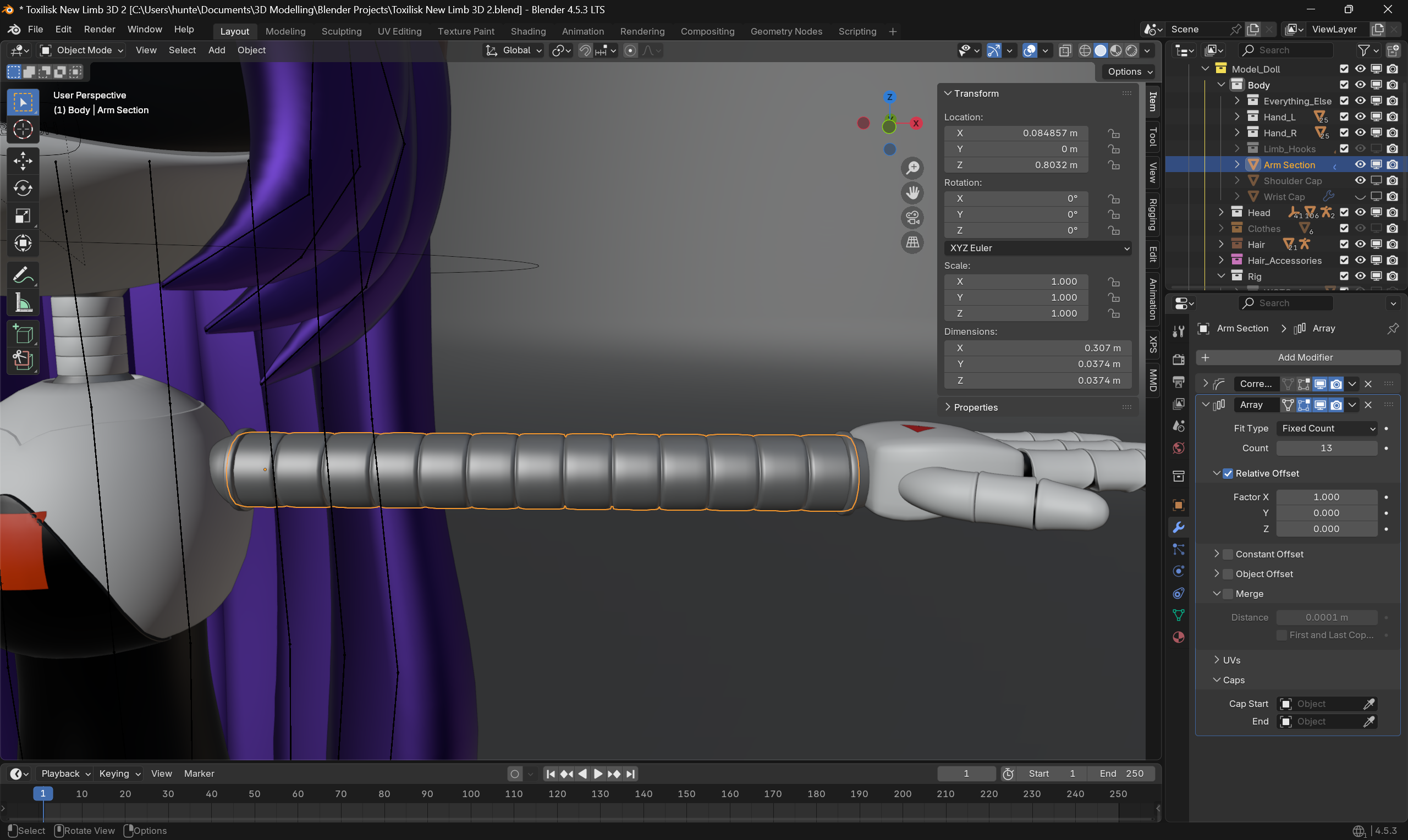 After that, I added an Array modifier with a relative offset of 1 on the x axis, then set the count to 13 and moved it along the x axis to line up with the shoulder.