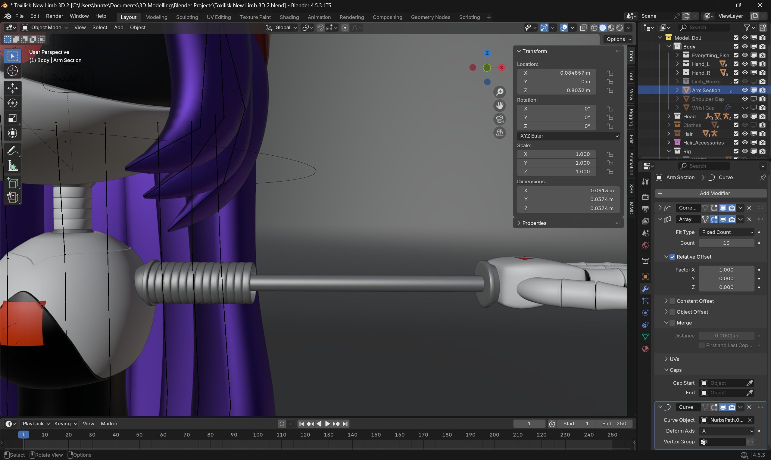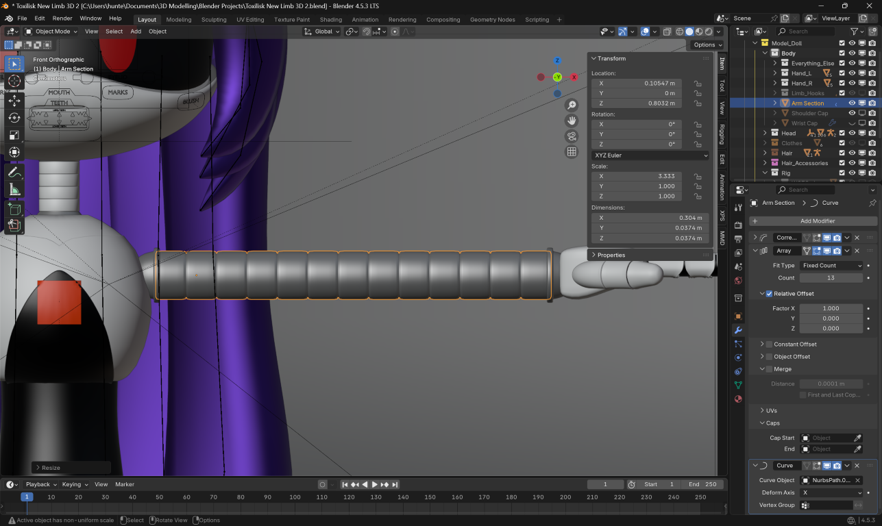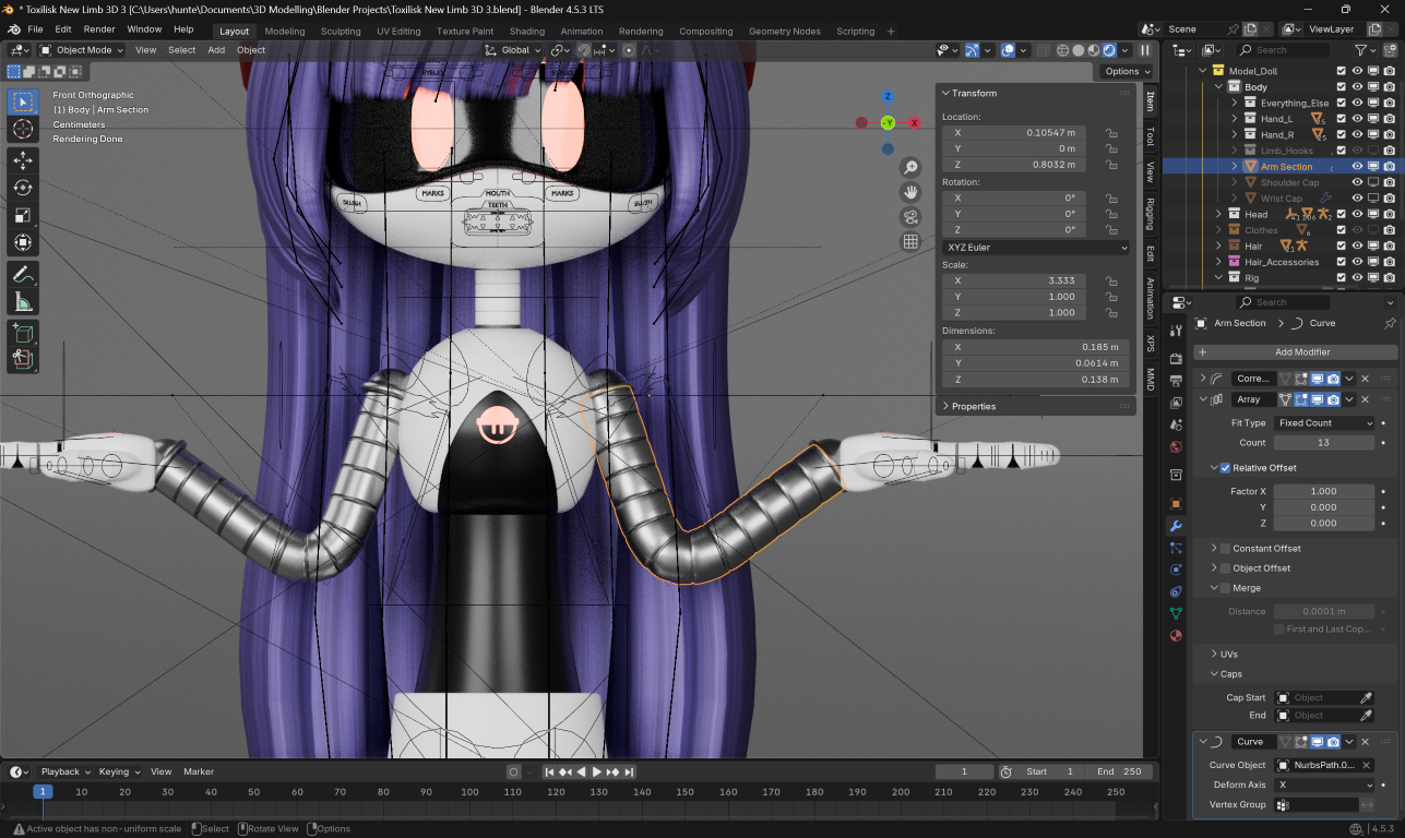 I cleared the parents, then copy and pasted them into a project with the new model (I'm using Doll for this example) and also applied the rotation. For now, I have them in the "Body" collection for visibility. Then I took the curve arm and made it thinner while enabling "Stretch" for the Curve Deform.