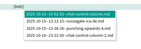 Typing [Link]( and then pressing Ctrl+Space does nothing. I have files in the same folder as I am editing. And no, PowerTools is not installed, so that shouldn’t be grabbing the shortcut.