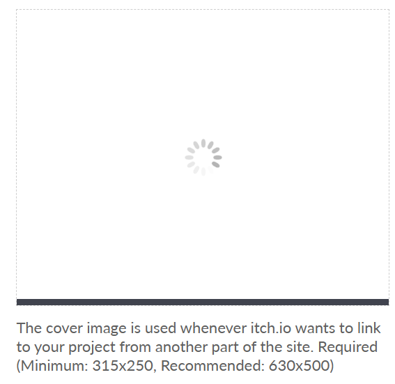 Not sure if it's just me or anyone else has encountered the same issue. It's my first time uploading my game, and I tried to upload a cover of exactly the format suggested (630x500, PNG and GIF). After the progress bar finishes, it just shows this loading icon forever. And when I check my project outside, it still does not have a cover.