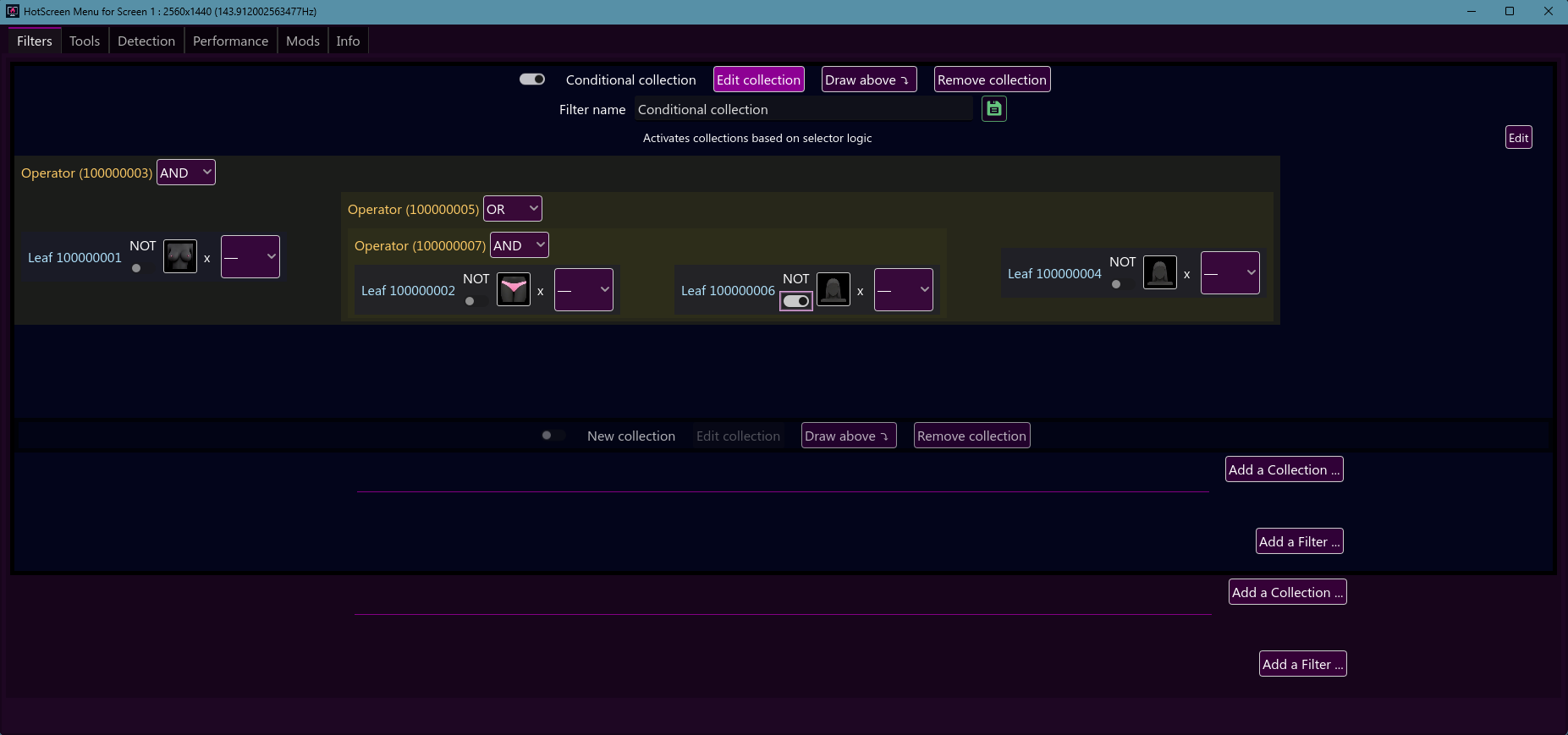 Heyo, I got an idea for a new collection type and didn't have too much better to do. So, I implemented it and it works pretty good! The idea was to apply Boolean expressions to detection types. Basically, its a multicollection that checks what the current detections are, what selections the user has made (body parts and boolean operators) and evaluates them for a truthy value. If the expression is true, and it's parent collection is enabled, enable all of the conditional collection's child collections. All in all, it's 6 files (3 tscn and 3 .gd) and a minor edit in config_reader.gd to add the new collection type to the LIST_BUILTIN_COLLECTIONS. I've uploaded the affected files to google drive. So, reach out if you're interested. I by no means think my implementation is perfect, I've never worked in Godot before this. But, I think it works pretty darn well.