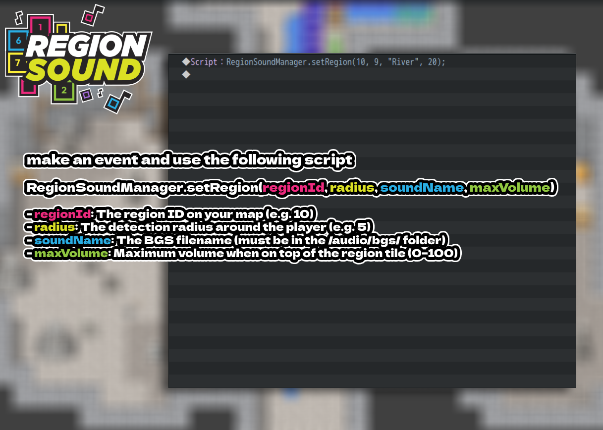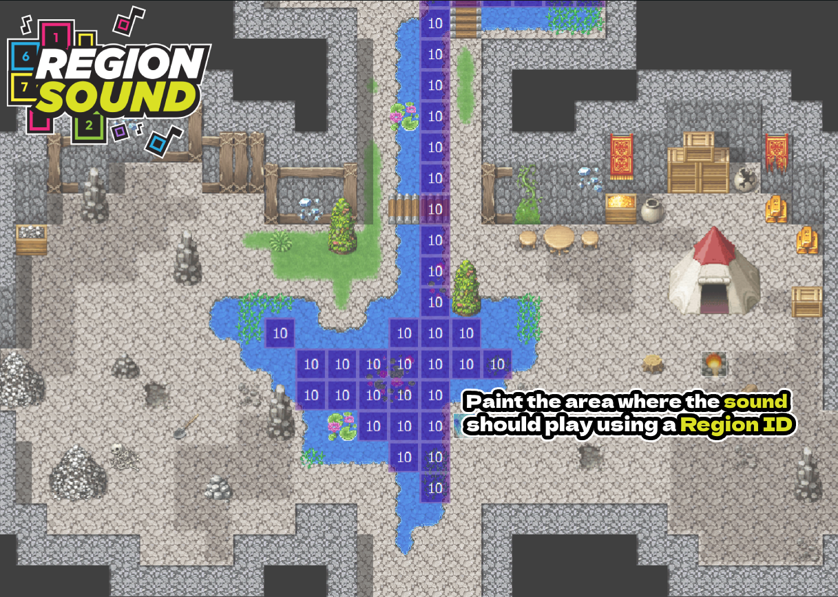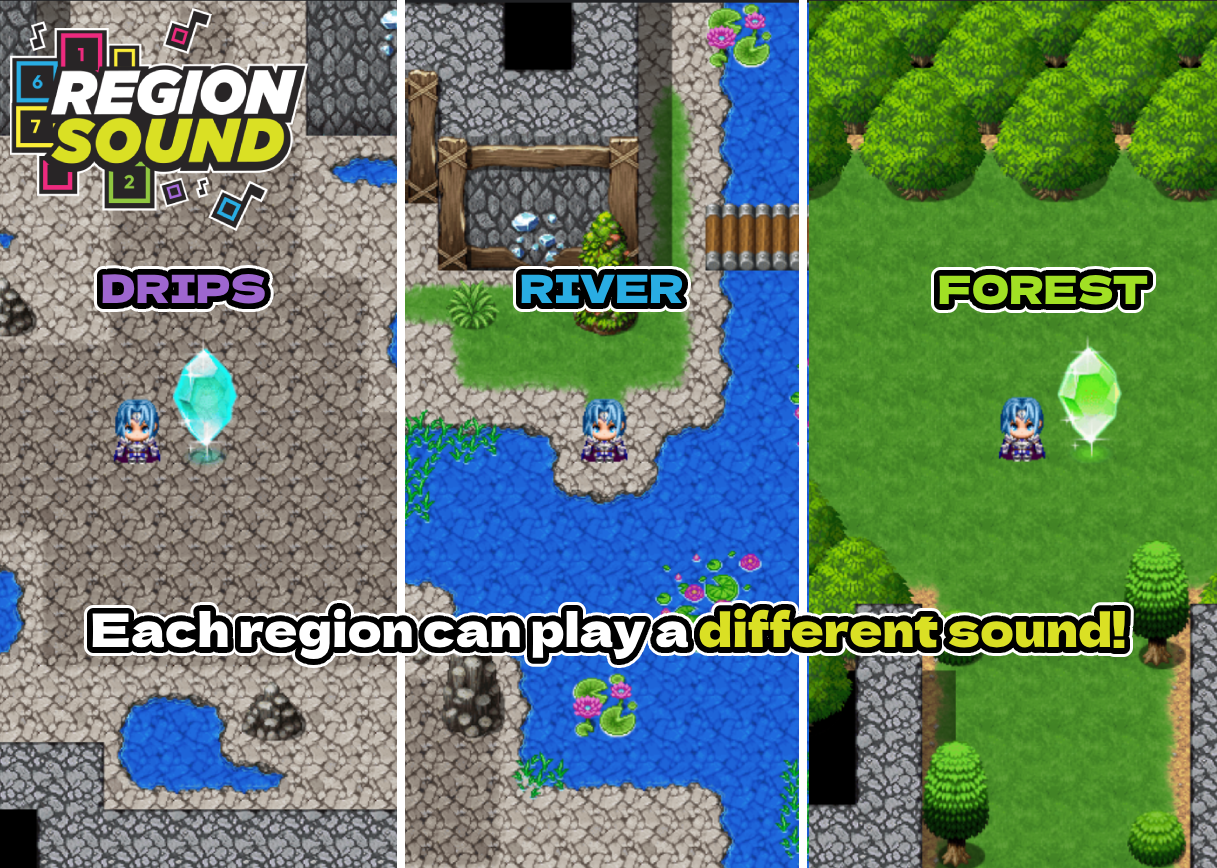 RegionSoundManager does one simple, handy thing: it binds ambient sounds (BGS) to map Region IDs. Paint your river with a Region, assign a water sound, and the plugin handles the rest—volume fades in as you get closer, fades out as you leave, and multiple regions can layer nicely for richer ambience.