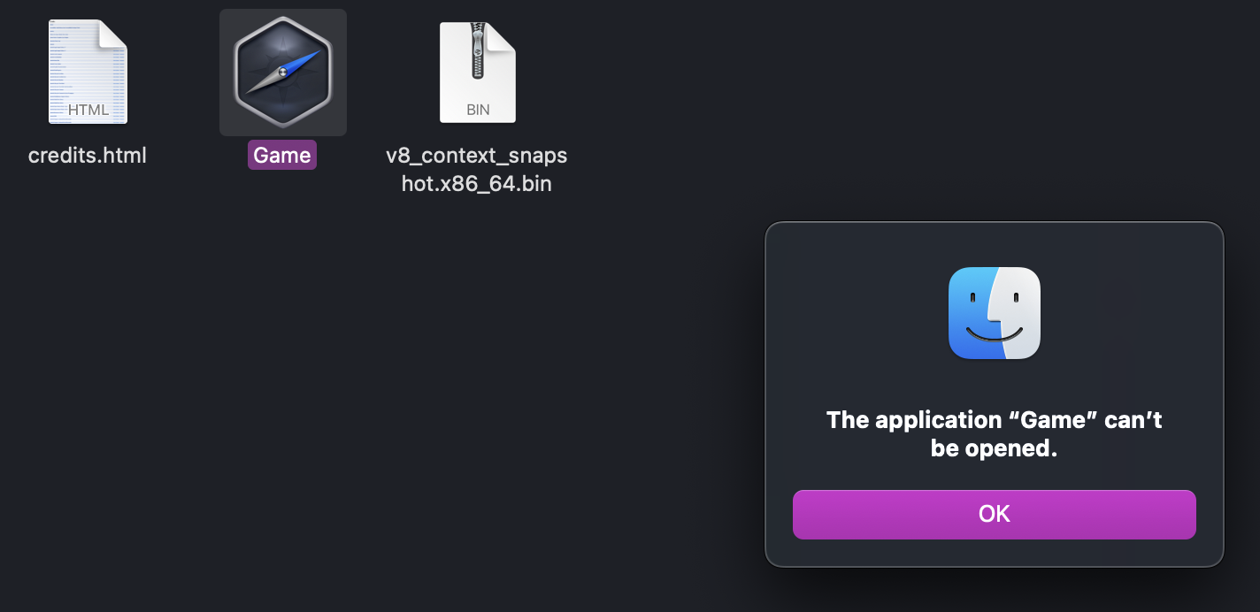 Howdy, I found a way to get the Mac version running. This is not a real fix, just me fumbling around until something worked. I downloaded the Mac OS X 64-bit version of NW.js and merged the content folder of the new NWJS with the content folder in the "Game". It seems to be working now. I've only scraped the surface of the game so I have no idea if I've broken anything yet.