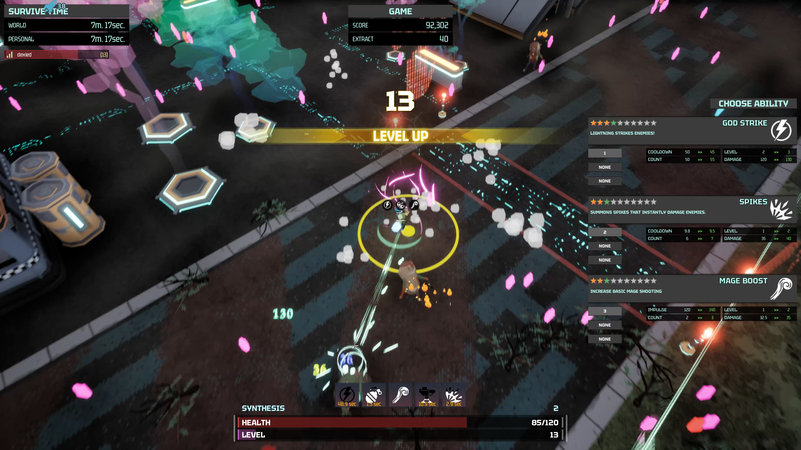 Boost your character's stats in the main menu! Use Synthesis, a resource you gather during your runs.