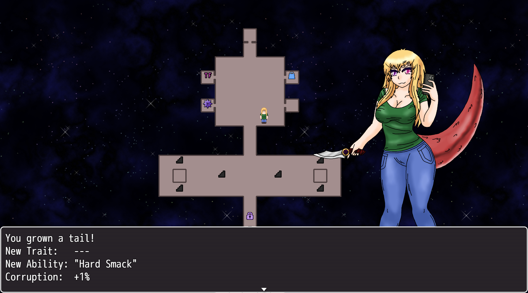 While traveling the various floors you may come across transformation artefacts. Using one will transform one random part of your body. The transformation depends on what artefact was used.