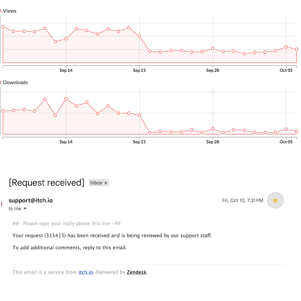 On 2025.10.10 (1 month and 14 days ago), I sent an email to support at support@itch.io asking for help and received the ticket number "Your request (315415)"