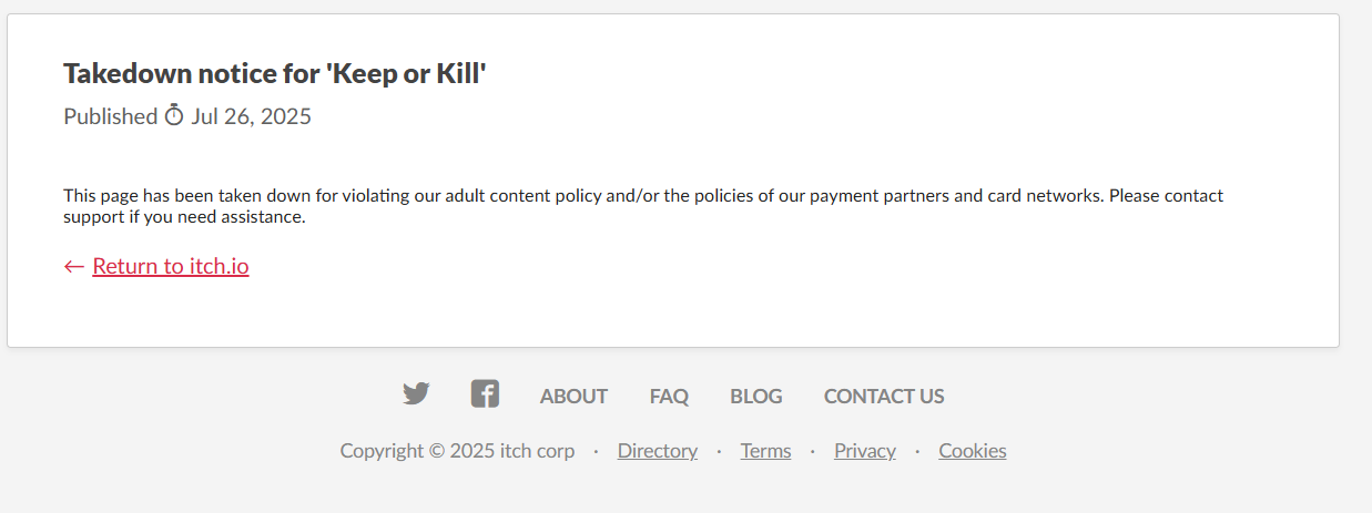 I'm seeing some posts saying that games weren't actually taken down or banned and that no one brought forth proof of otherwise. I wanted to say that's simply not true. Two of my games straight up got banned and are no longer available because of it and support will not respond to my appeal. It's really frustrating cause people who bought my games no longer have access, years of my development was taken down, and it makes me wonder if I should bother making new games that likely might just be taken down again.