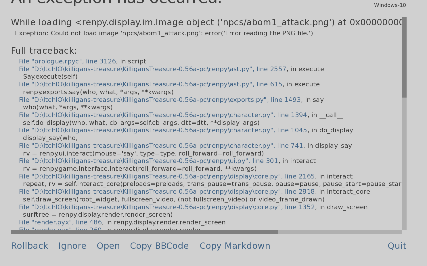 The second one is during Day 8 in Spiceport City, after Kiligan regrouped with Taavi and Mac, Izhashi called them into an alley. An error screen happened right after Mac said: "I didn't know what to expect meeting up with the pirates, so I thought it'd be good to bring it just in case, eheh..." and this error blocks the player from continuing the game completely