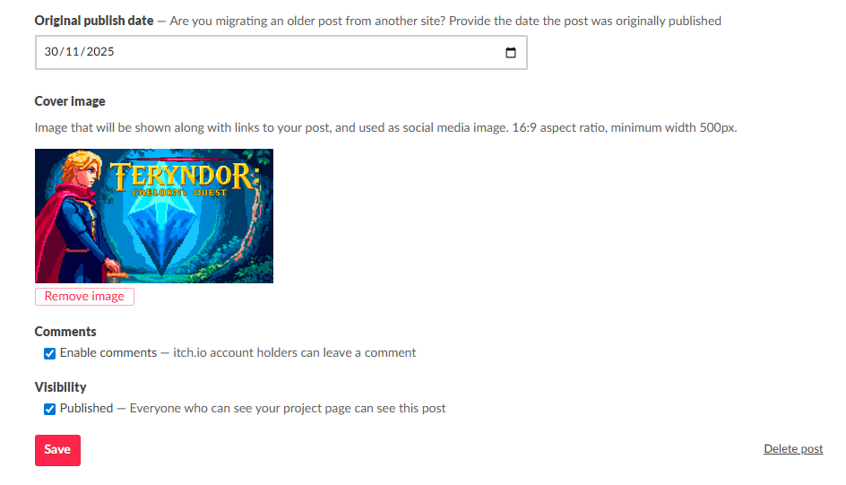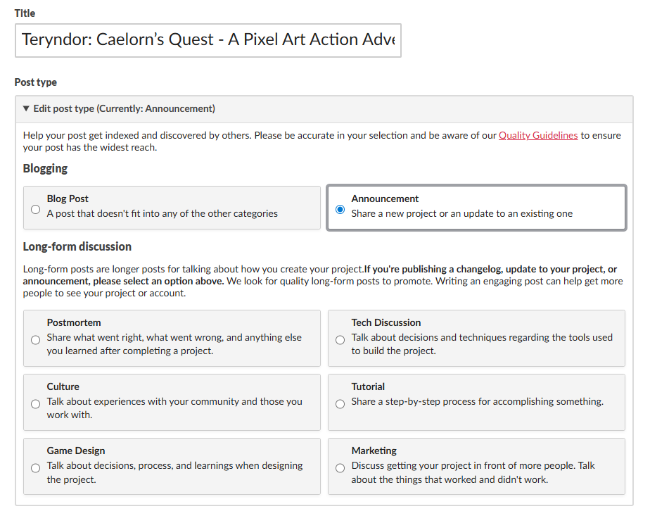 Here is the link to my post: https://itch.io/blog/1129212/teryndor-caelorns-quest-a-pixel-art-action-adventur...