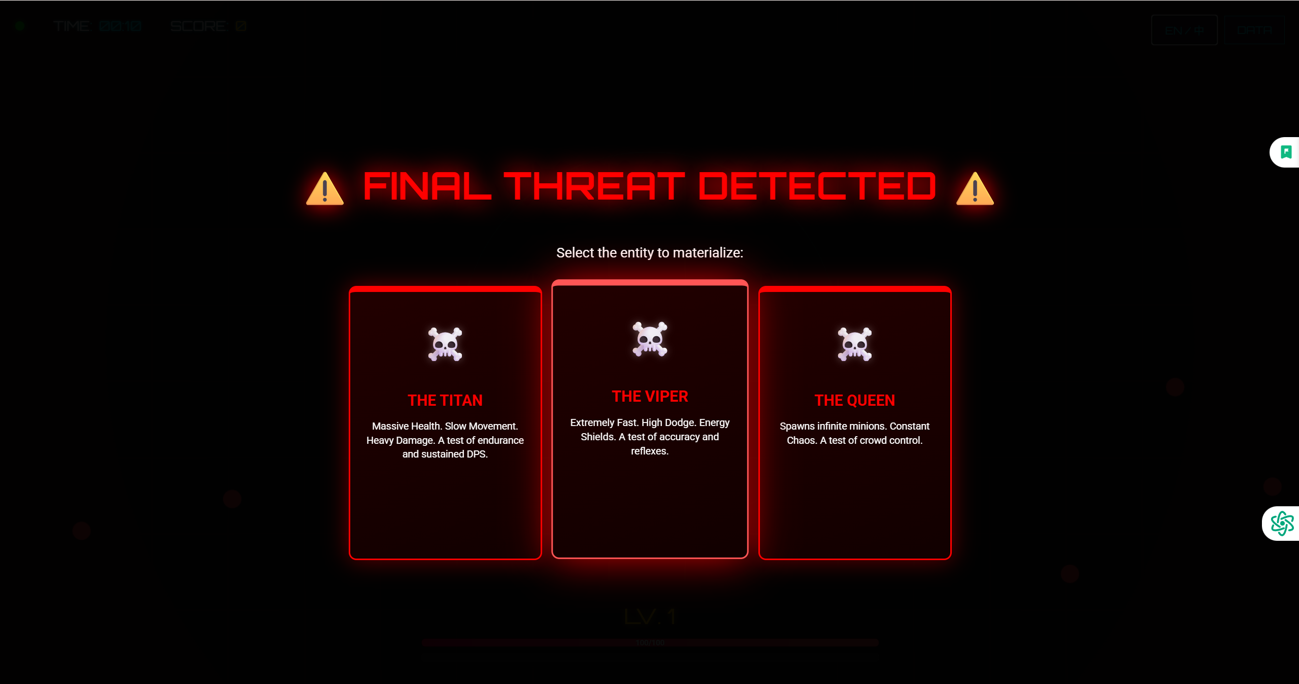 Thank you, and I appreciate your recognition, but this game is mostly AI-generated; I only provided the initial ideas. Regarding the issue you raised, I tested it and it seems the boss’s movement speed was too slow, causing it to not appear on the screen for extended periods. The AI-generated values weren’t thoroughly tested. I’ve just adjusted the boss’s movement data, so there shouldn’t be any problems now.