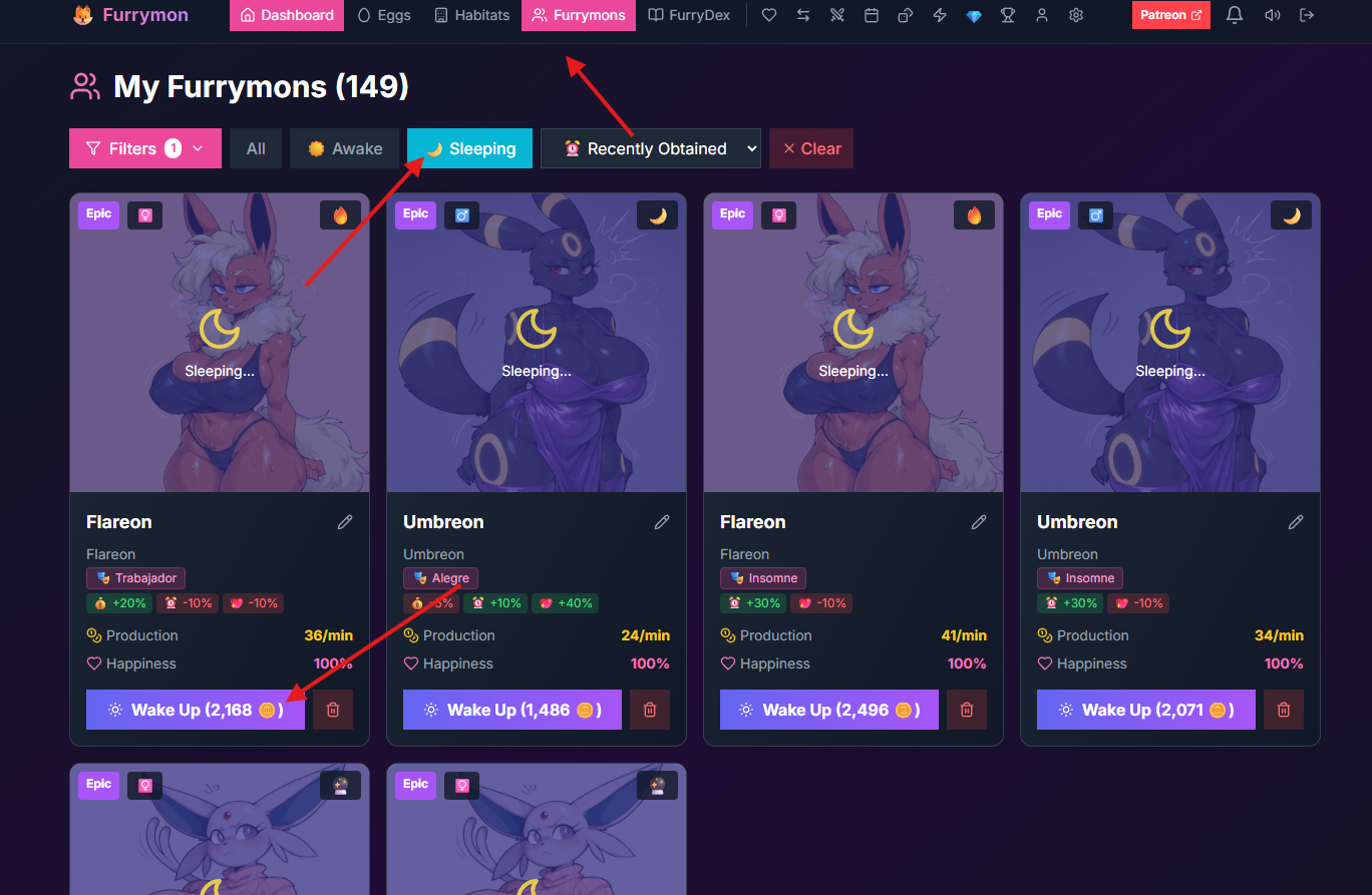 I tend to wake them up from the dashboard. After clicking on collect, the first click on a mon's portrait won't wake them up, but the second onward will, until you interrupt it with another Collect. Collecting each group's profits, then going from the bottom and waking everybody up lets you do it in sequence, even if the game hasn't finished waking up the previous 'mon yet. The furrymon tab, meanwhile, will constantly reposition them on the Sleeping filter as they start waking up so trying to move around the tab is a bit of a moot point.