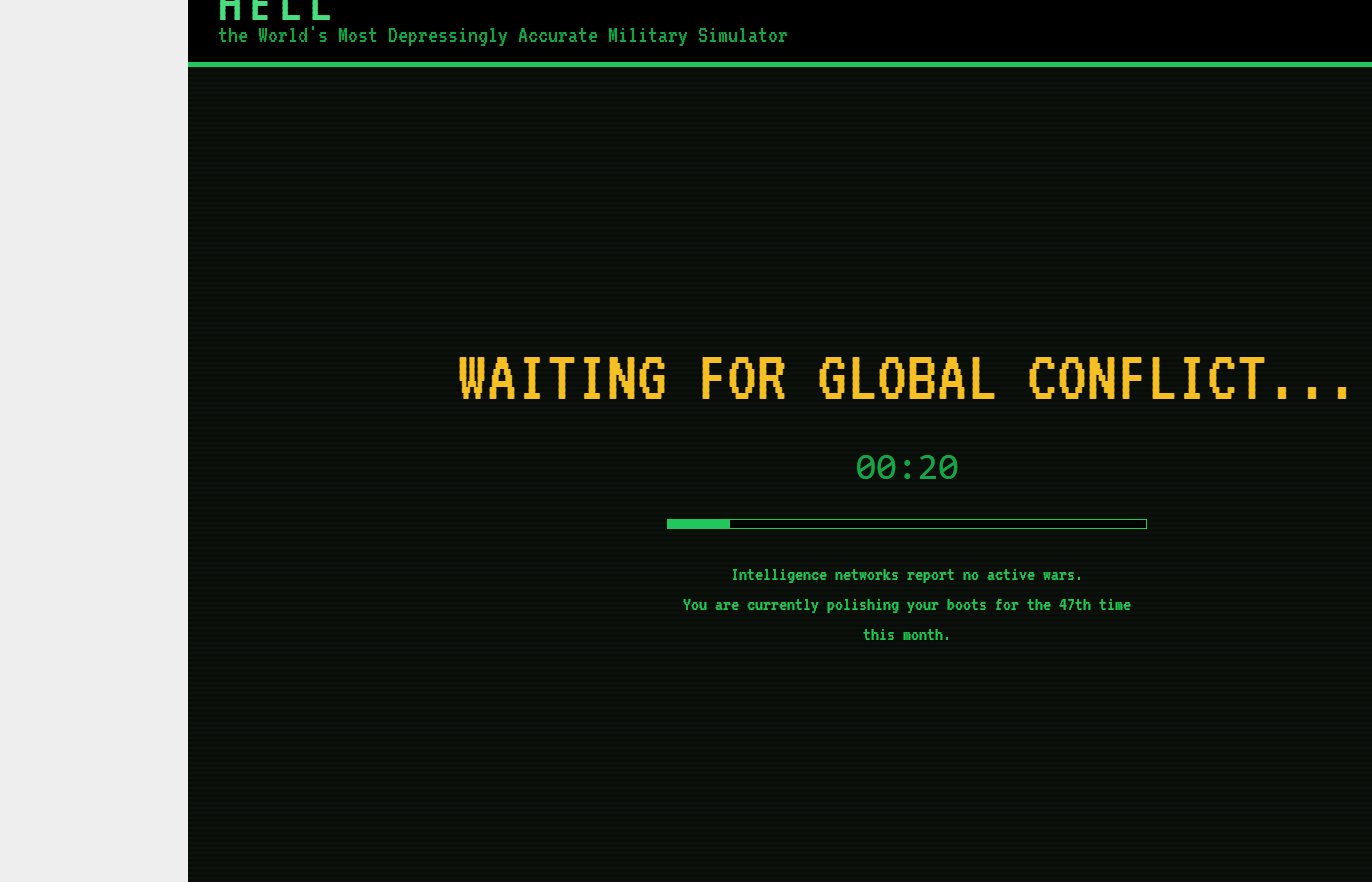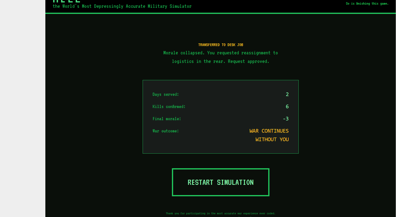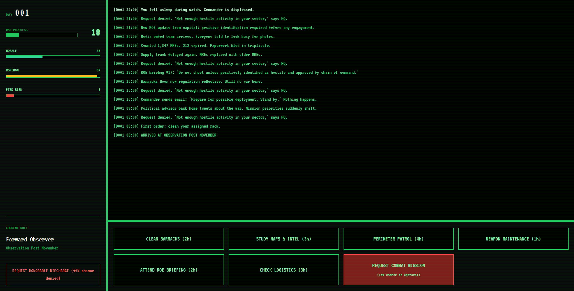 Recent events made me wonder what a war game would be like if it made no attempt at all to be fun, engaging for the player or have balanced gameplay, but simply reflected the experience of modern warfare (with all its boredom and unsatisfactory campaign endings).
