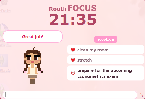 A cozy productivity companion that turns your work sessions into a digital study space. Whether you want to connect with your Twitch community or stay focused solo, your new virtual study buddy is here to support your progress! https://scoobxie.itch.io/rootlifocus