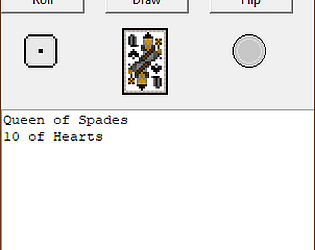 A simple tool for Solo Journal Rpg's. D6 die roller, Standard 54 deck card draw, coin flip, and a section for logs.